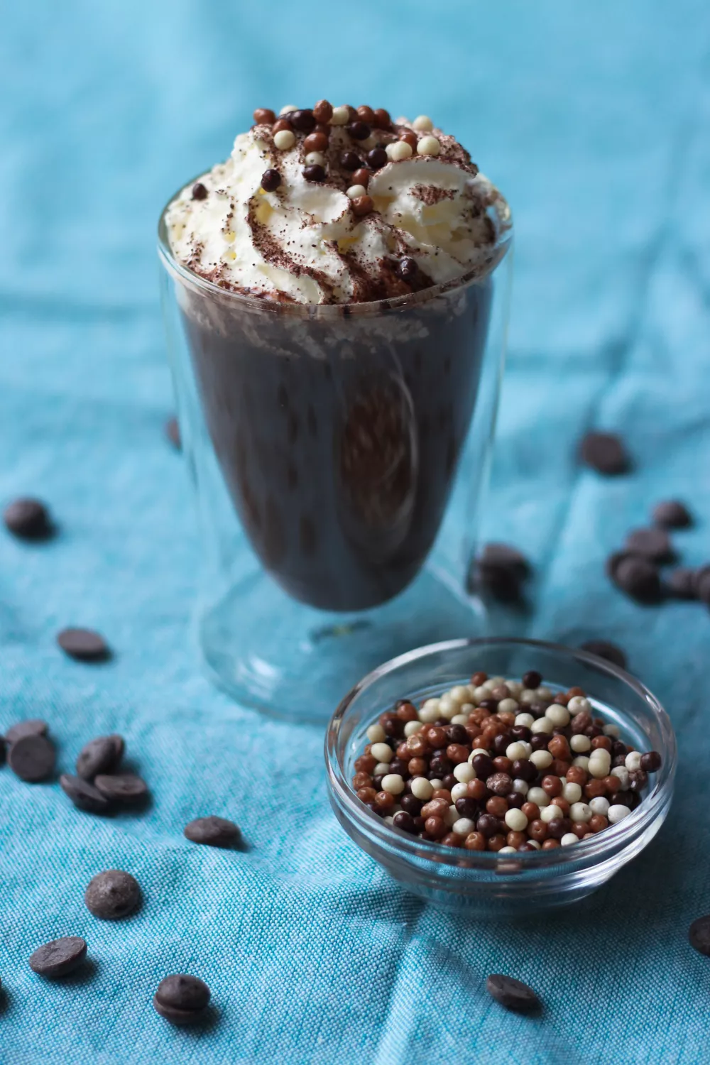 Giet de chocolademelk in een glas en werk af met slagroom en chocoladebolletjes.