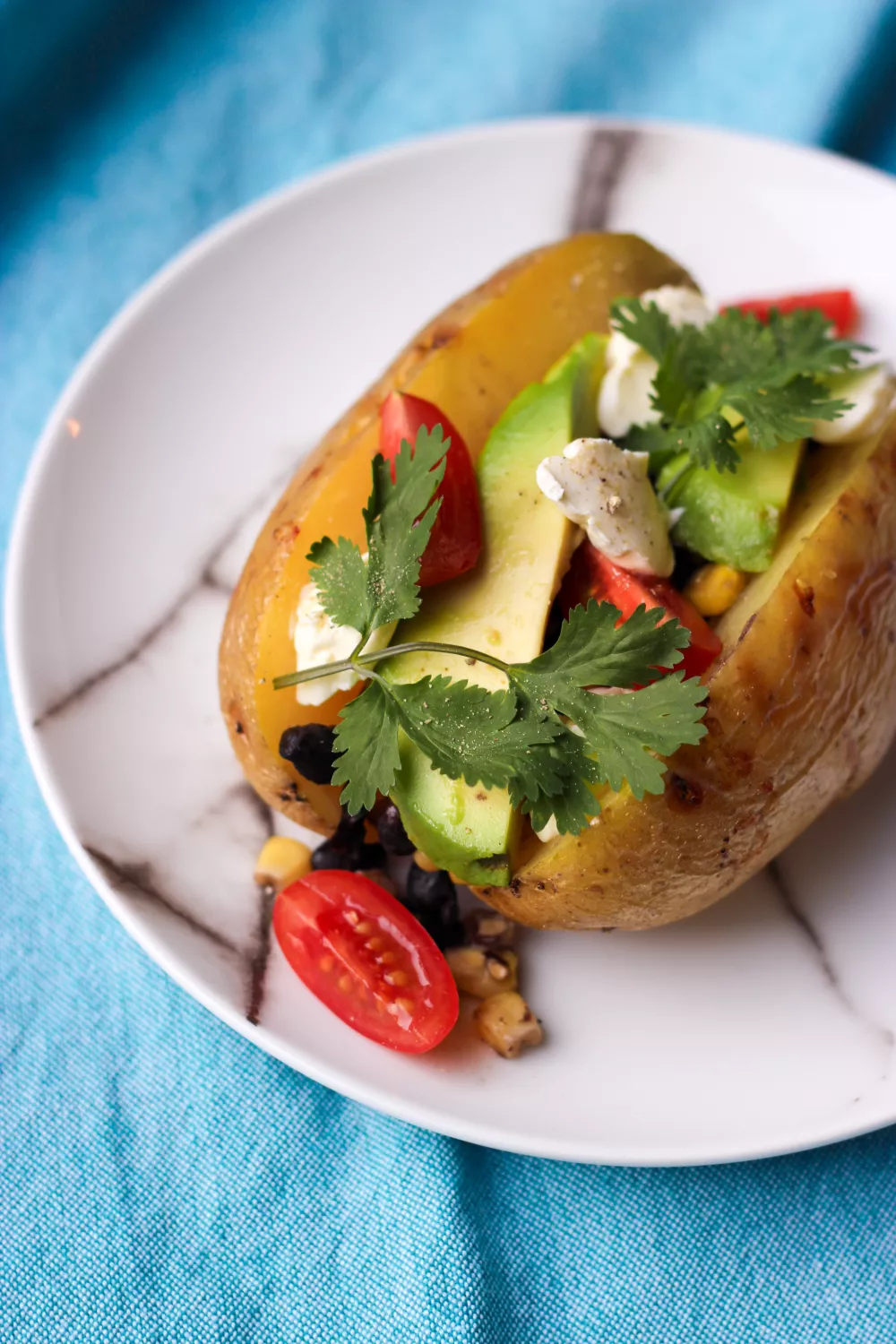 Vul de aardappelen met het bonenmengsel en beleg ze vervolgens met plakjes avocado, een lepeltje zure room en enkele kerstomaten. Werk af met enkele blaadjes koriander.