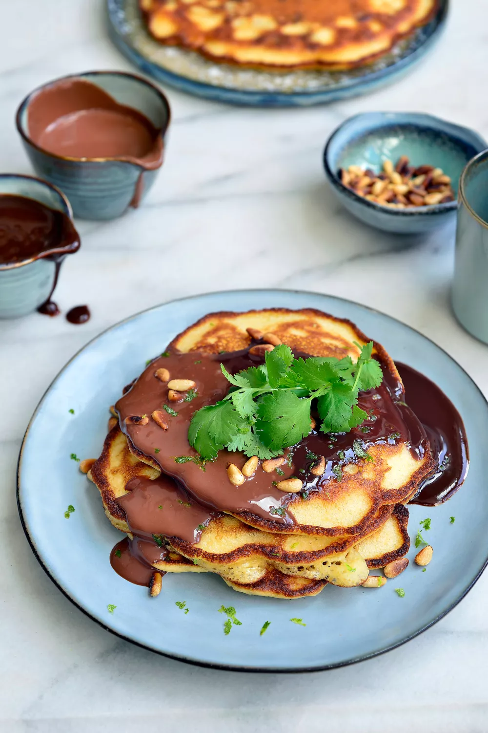 Zachte Mexicaanse pannenkoekjes op basis van maïsbloem en tarwebloem krijgen een knapperige toets door geroosterde pijnboompitjes en een frisse limoenrasp. Ze worden in de pan gebakken en met honing gekaramelliseerd, en geserveerd met een pure chocoladesaus met chili en koriander en een romige karamel met passievrucht, guave en kokosmelk. Perfect als feestelijk dessert of zoete brunch, heerlijk voor liefhebbers van chocolade en tropisch fruit.