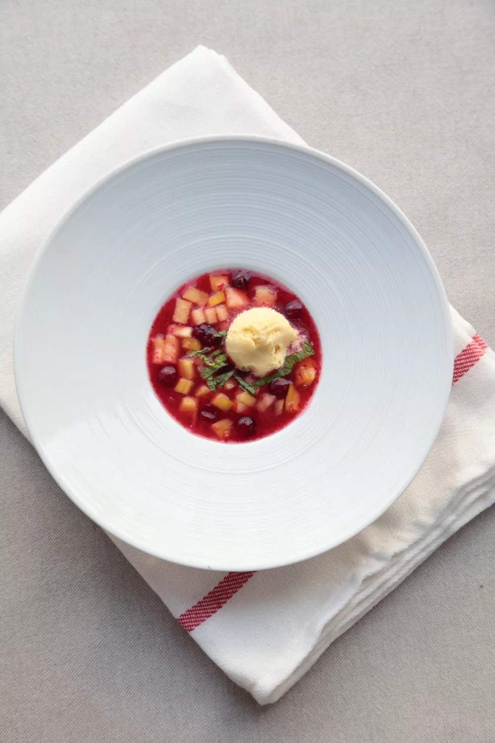 Deze fruitminestrone is een verfrissende dessertsoep voor zomeravonden, picknicks en feestelijke brunches. Een kruidige siroop van limoen, tomaatsap, suiker, kardemom, steranijs en vanille wordt rustig gekookt en getrokken, daarna afgewerkt met munt en een vleugje jenever, en over seizoensfruit gegoten. Serveer ijskoud met een bol vanille ijs voor een elegante afsluiter.