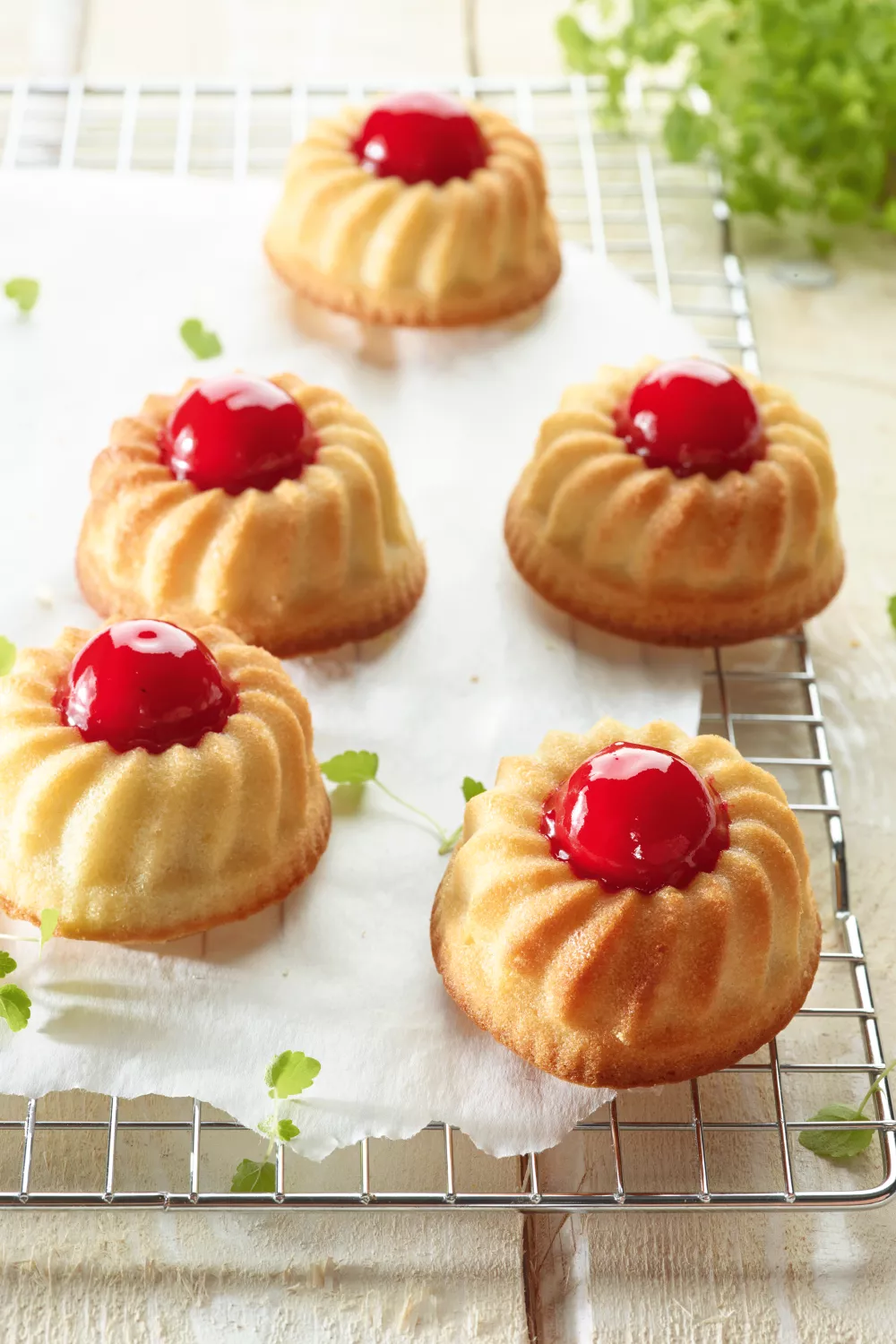 Mini tulbandjes met zijdezachte aardbeiencrémeux: luchtige amandelcakejes met gesmolten boter en amandelpoeder, afgewerkt met een frisse crémeux van aardbeienpuree, mascarpone en limoensap. De vulling wordt kort verwarmd en opgesteven met gelatine zodat je er mooie bolletjes van kunt scheppen. Perfect als lentegebakje, brunchdessert of bij de koffie.