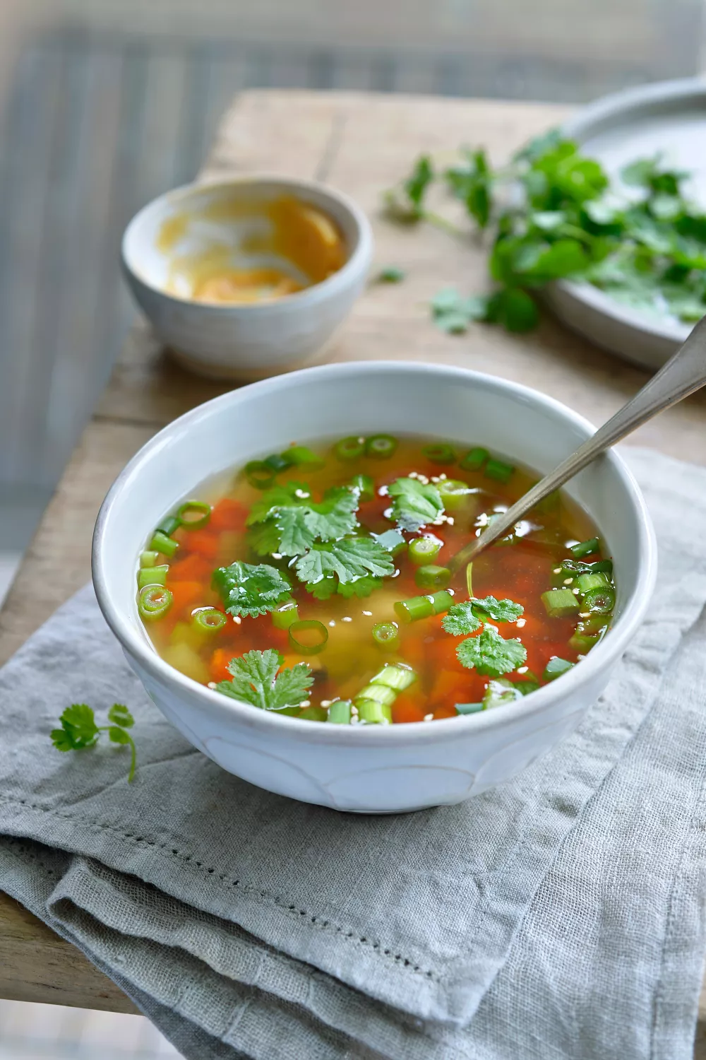 Deze lichte misosoep met champignons biedt een warme, umami-rijke smaak en frisse koriander als tegenwicht, perfect als soepje of snelle lunch. Met witte misopasta en fijn gesneden paprika, wortel en selder zet je dit Aziatisch geïnspireerde, vegetarische gerecht in enkele minuten klaar. Roer de miso pas door de hete bouillon van het vuur zodat de volle smaak en levende culturen behouden blijven.