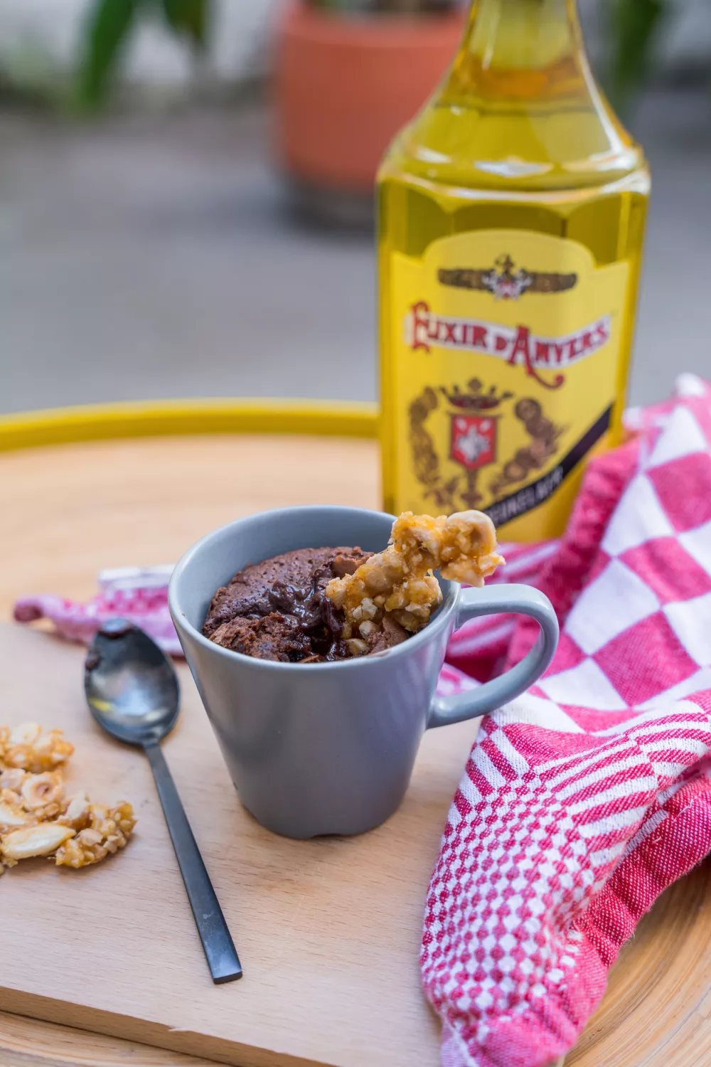Fluweelzachte moelleux mugcakes met intense donkere chocolade en een scheutje Elixir d'Anvers, afgewerkt met krokante notenkaramel. De chocolade en boter smelten langzaam, eieren en suiker worden luchtig geklopt en gezeefde bloem geeft structuur; kort bakken in vuurvaste kopjes zorgt voor een smeuïg, lopend hart. Perfect als verwarmend dessert voor een gezellige avond of als feestelijke traktatie in koude maanden.