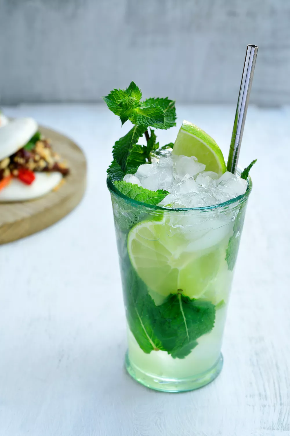 Vul het glas verder op met crushed ice en top af met het bruiswater. Afwerken doe je met een vers takje munt en limoen.