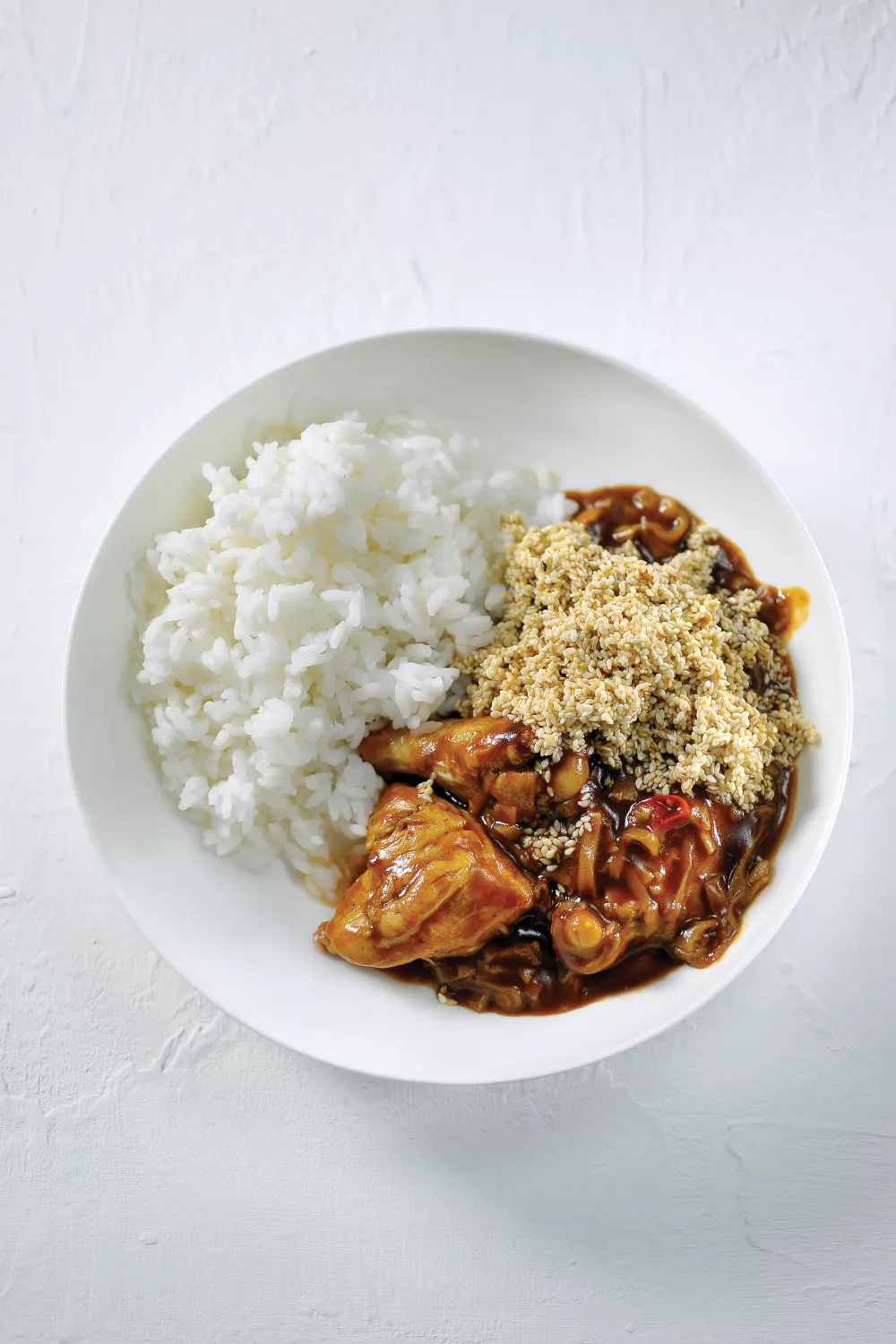 Serveer de mole poblano samen met de rijst. Bestrooi met de geroosterde sesamzaadjes.