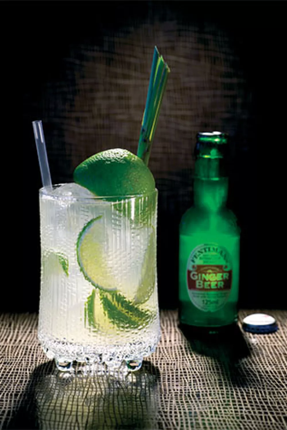 Giet de wodka en het limoensap in het collinsglas. Snijd de limoen in partjes, knijp ze uit en doe ze in het glas. Vul het glas met ijsblokjes en voeg het gemberbier toe.