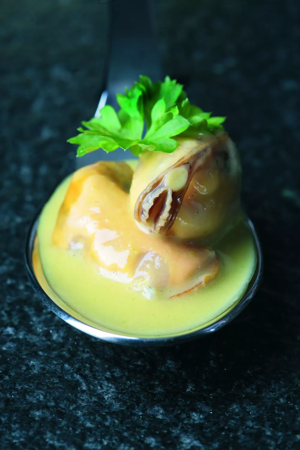 Laat 4 dl mosselvocht met de witte wijn, ui, kerriepoeder en kruidenboeket tot 1/3 inkoken ('reduceren').