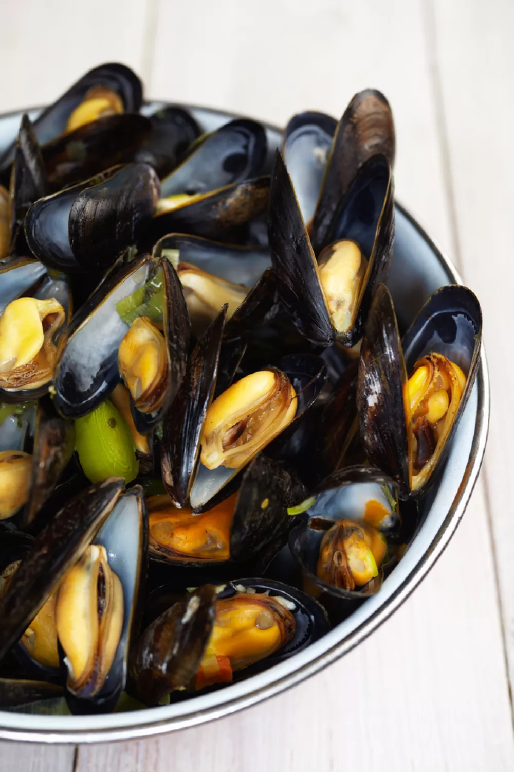Schud de mosselen even op. De mosselen zijn gaar als alle schelpen open zijn.