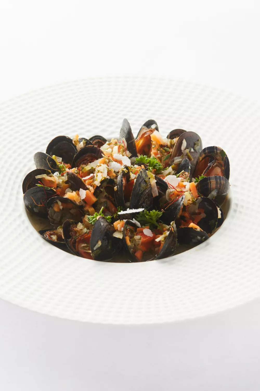 Meng de mosselen met de groenten, ui, knoflook, gember, witte wijn, peterselie, dragon, saffraan en ketchup en giet alles over in de traybake van de airfryer. Leg er enkele klontjes boter op en kruid met peper en zout. Gaar de mosselen 15 minuten op 200 °C in de airfryer. Schep tussendoor 1 à 2 keer om zodat de jus terug over de mosseltjes loopt.