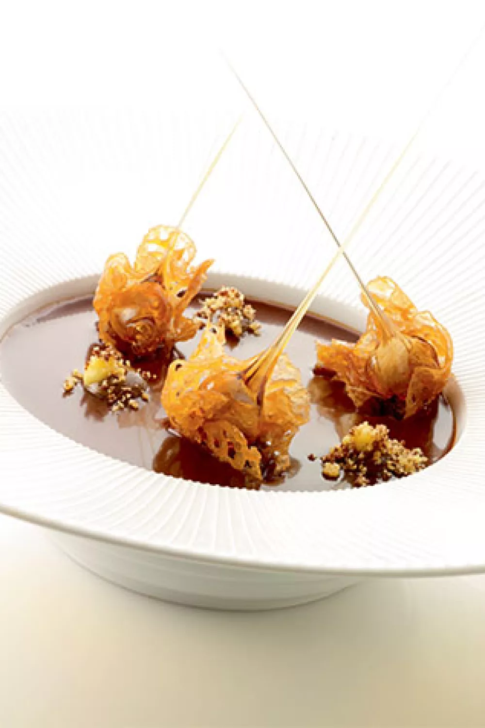 Carameliseer de suiker en doop er de hazelnoten in. Haal de noten uit de gecarameliseerde suiker en zorg ervoor dat er een druppel caramel blijft aanhangen. Laat de druppel uitharden en leg de hazelnoot in de kletskop-kuipjes.