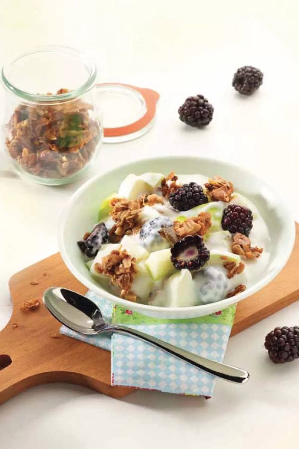 Verwarm de oven voor op 175 °C. Hak de noten fijn. Meng alle ingrediënten behalve de yoghurt en het fruit in een grote kom.