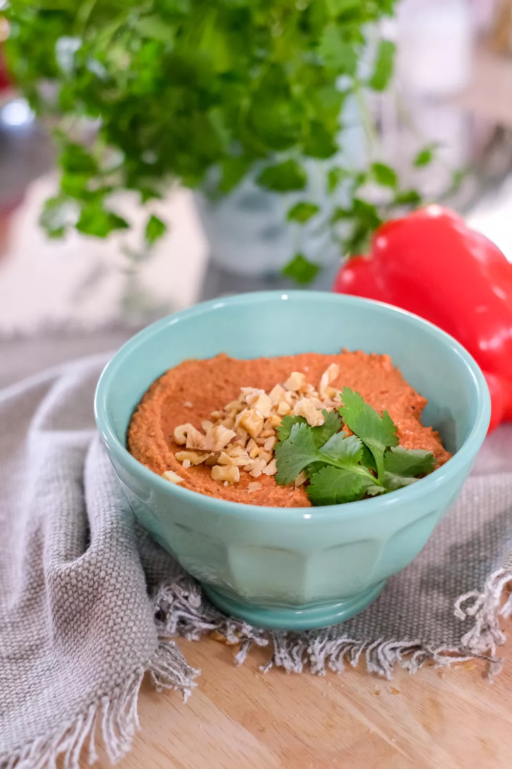 Smeuïge muhammarra met geroosterde rode paprika's, rijke walnoten en een frisse toets sumak. De paprika's gaan in de oven tot ze zacht zijn en worden samen met tomatenpuree, ahornsiroop en olijfolie in de chopper tot een fluweelzachte spread gemixt. Heerlijk als dip bij brood, als mezze of als smaakmaker bij gegrilde groenten en salades.