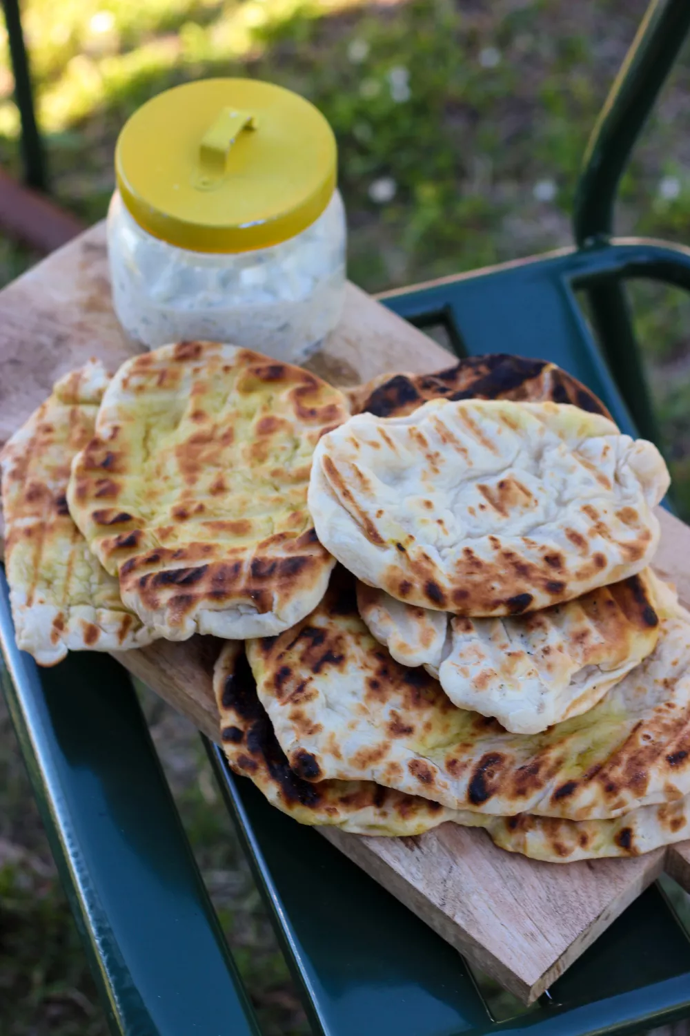 Zacht luchtig naanbrood met verse gist, honing en boter krijgt extra diepte door sesam, venkel en een geurende olijfolie met komijn en curry. De frisse yoghurtdressing met komkommer, appel en knoflook vormt een lichtzoete tegenhanger bij het kneden, laten rusten en kort grillen op de barbecue. Perfect als zomers bijgerecht, brunch of kleurrijke borrelhap.