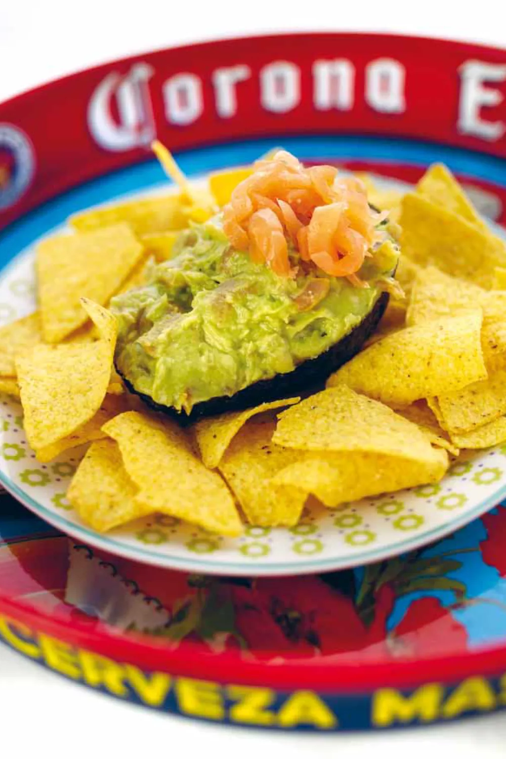 Romige guacamole van rijpe avocado's met flinterdunne sliertjes gerookte zalm verenigt frisse limoen, koriander en knoflook tot een smaakvolle dipsaus bij krokante nacho's. Deze makkelijke, snelle borrelhap past perfect bij zomerse tuinfeestjes of een gezellige filmavond en vraagt enkel pellen, pletten, fijnsnijden en mengen. Klaar in enkele minuten en heerlijk om met vrienden te delen.