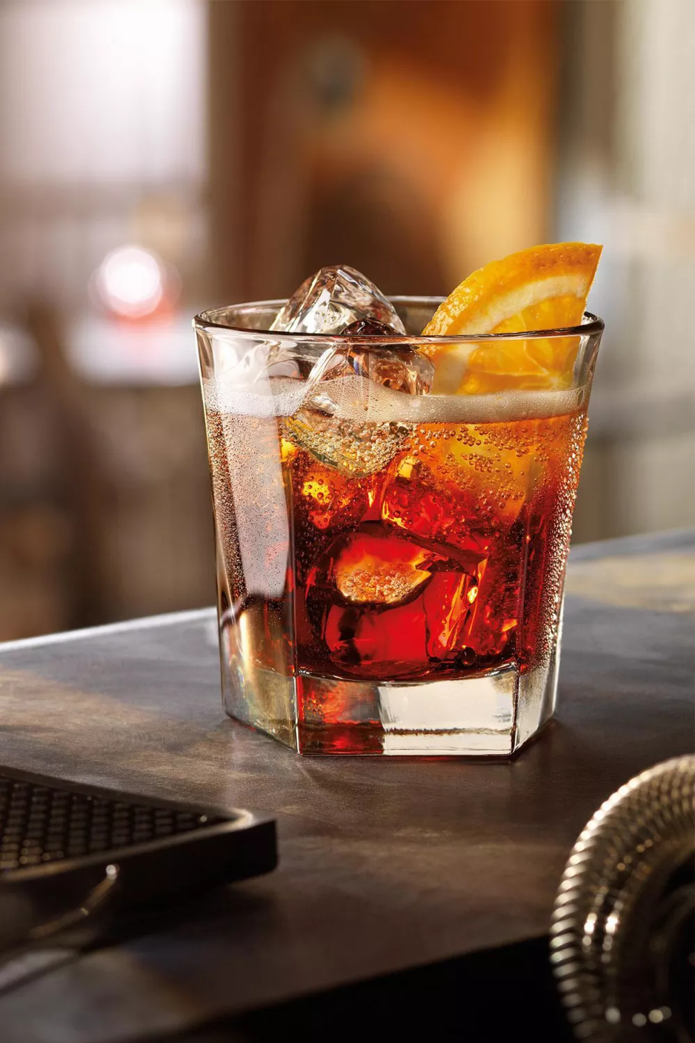 Doe de ingrediënten één voor één in een hoge tumbler met ijs. Garneer met een schijfje sinaasappel.