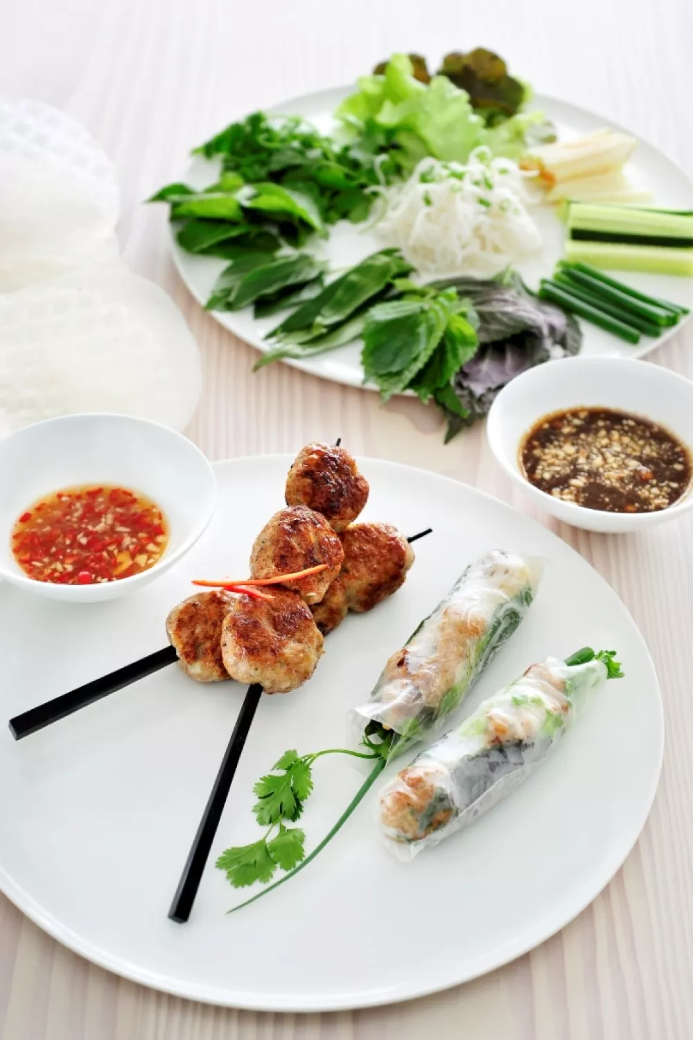 Nem nuong balletjes van garnalen en varkensvlees brengen frisse Aziatische smaken samen in zachte rijstpapierrolletjes, met munt, koriander en knapperige groente. Fijngehakt vlees en scampi worden gekruid, tot balletjes gevormd en op satéstokjes gebakken of gegrild, waarna je ze met rijstvermicelli en julienne komkommer oprolt. Perfect als zomerse borrelhap of lichte maaltijd, geserveerd met een pittige zwarte bonensaus en wat geroosterde pinda's.