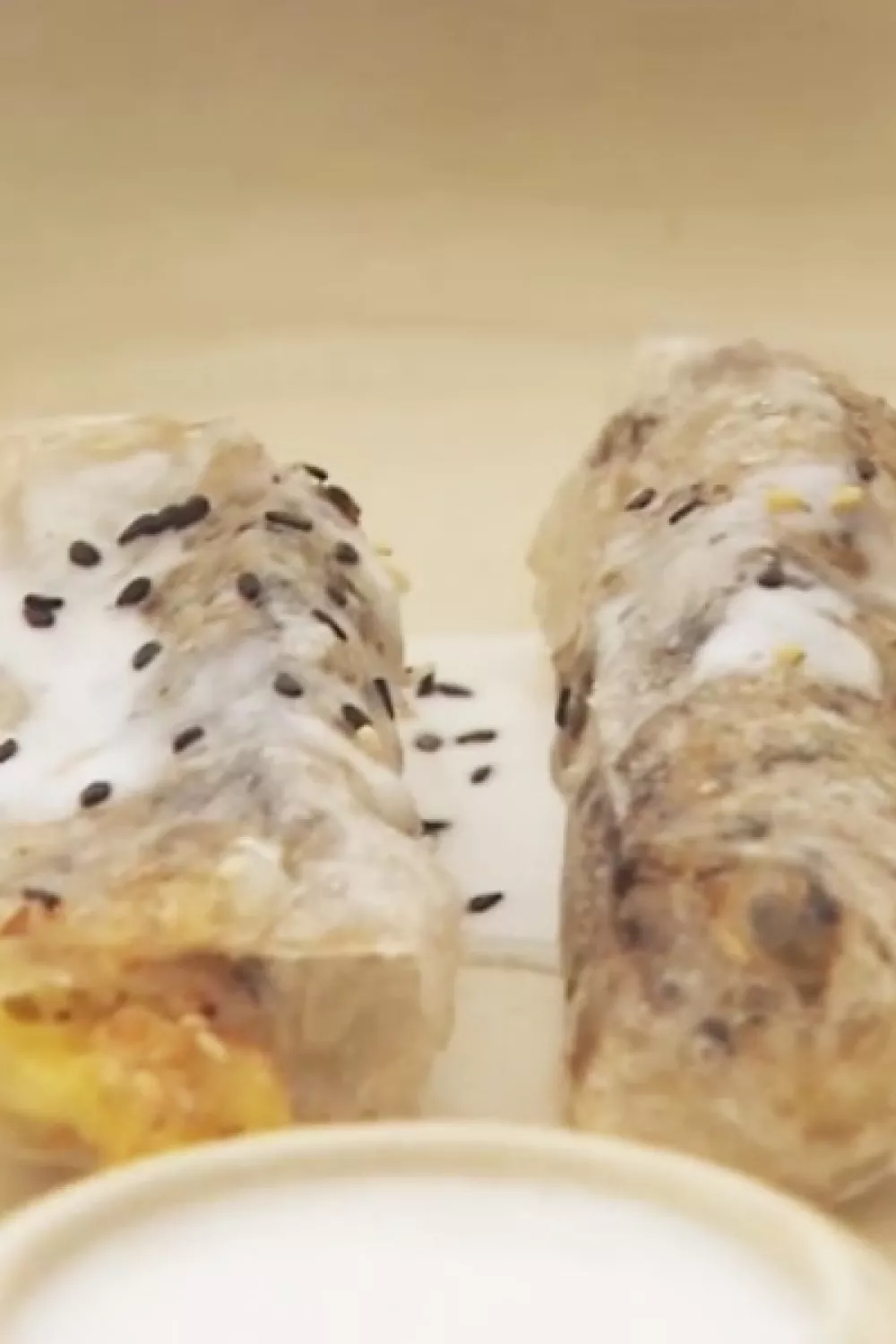 Snij de banaan door midden en vervolgens nog eens in de lengte in de helft. Week de vellen rijstpapier in heet water. Beleg ze met een stukje banaan, een eetlepel bruine suiker, witte en zwarte sesamzaadjes.