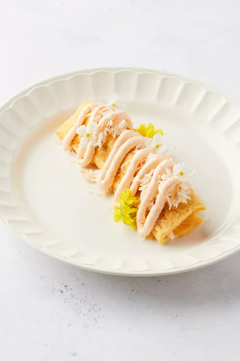 Een luchtige omelet gevuld met zacht Noordzeekrabvlees en pittige sriracha zure room, die frisse zeevruchten met een vleugje hitte combineert. De zure room wordt met gelatine opgesteven en tot een romige, spuitbare saus geklopt, terwijl de eieren zachtjes op laag vuur garen en daarna voorzichtig worden opgerold. Perfect als verfijnd lunchgerecht of elegant voorgerecht, afgewerkt met koolzaad en knapperige radijsbloemen.