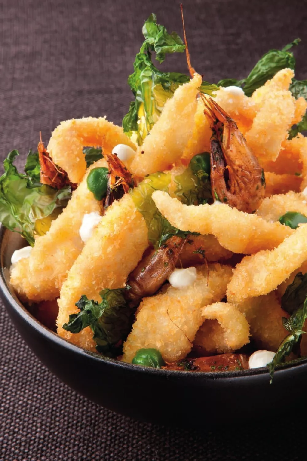 Malse Noordzeetongfilets in een krokant jasje van bloem, eiwit en panko, geserveerd met een frisse groene mayonaise van peterselie en spinazie en gebakken ongepelde garnalen. De tong wordt gefileerd en gefrituurd tot goudbruin, de mayo wordt met de staafmixer tot een romige emulsie gebracht en zeesla wordt langzaam gedroogd in de oven voor een knapperige finishing touch. Perfect als elegant voorgerecht bij een zomers of vroegherfstsmaal wanneer de garnalen in seizoen zijn van september tot november, ideaal voor een feestelijk diner of een lichte lunch aan zee.