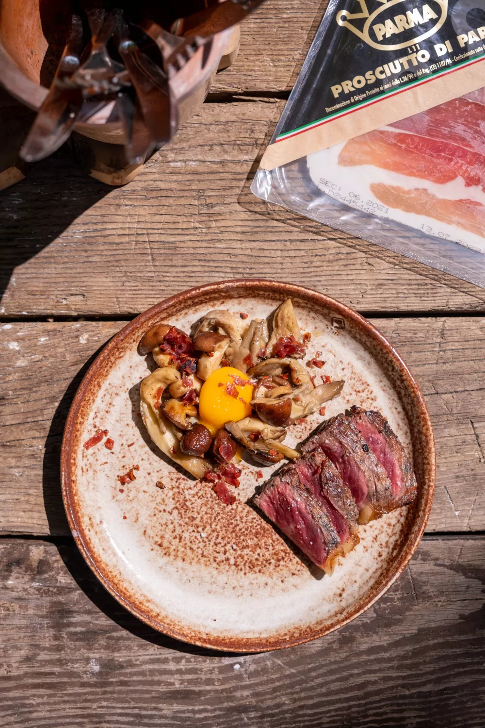 Verdeel de gebakken champignons over bordjes. Maak een holte in het midden en lepel er een gerookte eidooier in. Snijd het vlees in plakjes, bestrooi met grof zout en verdeel over de borden. Breek de krokante Parmaham in stukjes en werk de gerechtjes hiermee af.