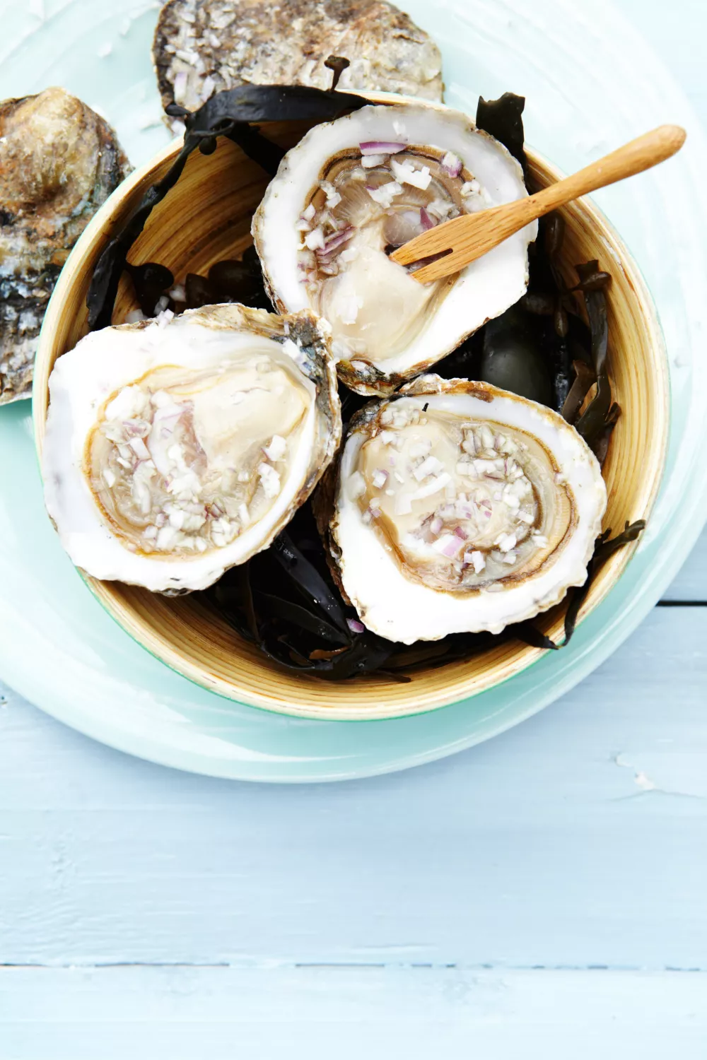 Steek de oesters open en verwijder eventuele stukjes schelp. Leg ze op een schaal met gemalen ijs, grof zout of op een bedje van zeewier.