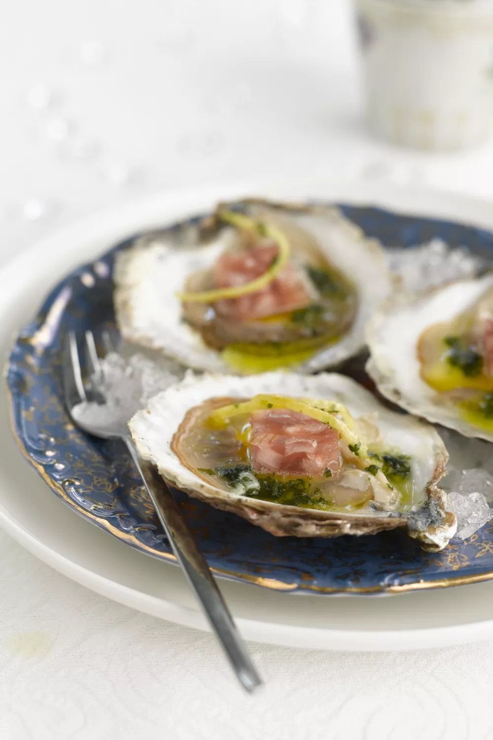 Lichte feestelijke oesters met sjalottengelei en warme hoeveboter combineren zilte zeevruchtensmaken met boterige rijkdom en een frisse citroenzeste. De sjalotten worden in witte wijn en rode wijnazijn tot een gelei met agar agar gekookt, waarna blokjes gelei en een lepeltje warme hoeveboter met peterselie de oesters afronden voor een elegante textuur en diepe smaak. Perfect als luxe voorgerecht of feestelijke amuse op schilferijs, ideaal voor lente en winter.