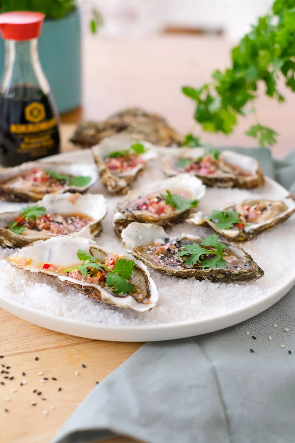 Deze frisse oesters met een pittige sojadressing zijn het perfecte elegante voorgerecht voor zomerse diners en feestelijke borrels. Een dressing van honing, rijstazijn, sojasaus en limoensap, verrijkt met sjalot, chili en gember, geeft zilte oesters een zoet-pittige Aziatische twist. Lepel de dressing over verse oesters en werk af met sesamzaadjes en koriander voor een snelle, verfijnde amuse.