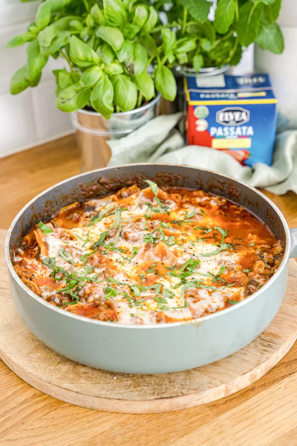 Deze one pan lasagne combineert romige passata, sappig gehakt en zachte aubergine tot een eenvoudige en hartverwarmende pastaschotel. Alles wordt kort aangebakken en vervolgens rustig gesudderd zodat de smaken goed in elkaar trekken en de lasagnebladeren zacht worden. Klaar in één pan met een gouden laag gesmolten mozzarella en verse basilicum voor een gezellige doordeweekse maaltijd of zomerse familiebijeenkomst.