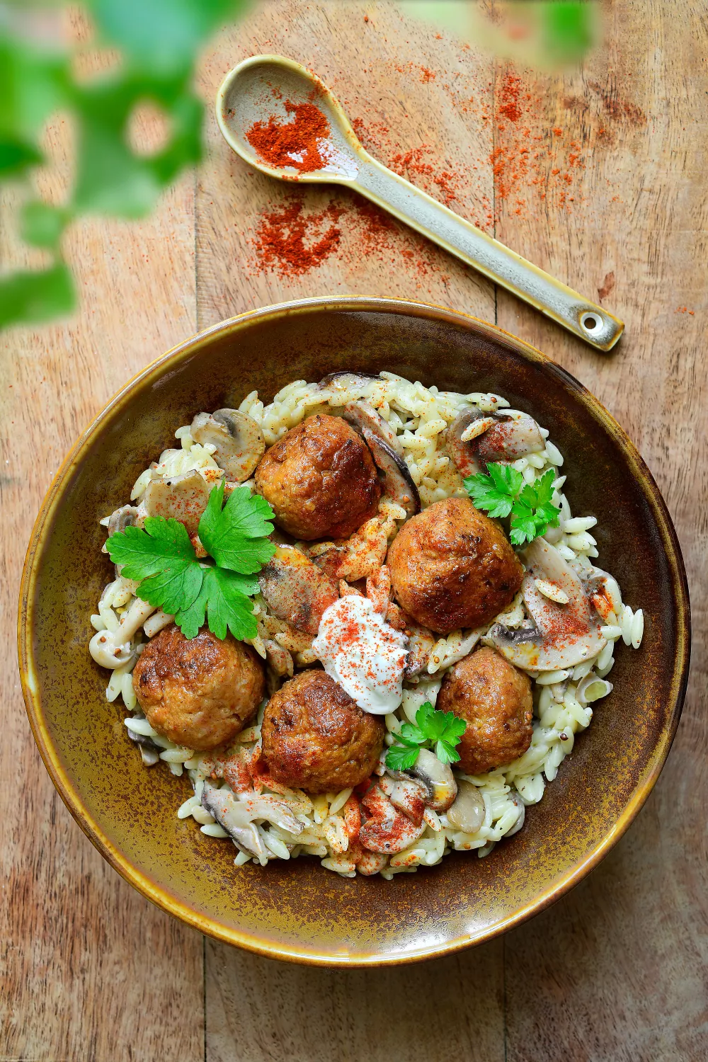 Romig en hartig eenpansgerecht met sappige kippenballetjes, kastanjebruine champignons en een stroganoffsaus op basis van graanmosterd en zure room, geserveerd met orzo. Je bakt de balletjes aan, blust met witte wijn en laat alles zachtjes pruttelen zodat de orzo het vocht opneemt en de smaken samensmelten. Perfect als snel doordeweeks familiediner of verwarmende maaltijd voor herfst en winter.