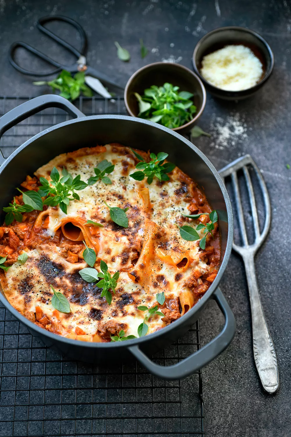 Deze one pot lasagne brengt geraffineerde comfort food in één pan, met sappig rundergehakt, wortel en selder in een kruidige tomatensaus. De lasagnevellen garen rechtstreeks in de saus en bovenop vormt een mengsel van mozzarella, Parmezaan en crème fraîche een goudbruine kaaskorst onder de grill. Een hartig familiegerecht, ideaal voor doordeweekse avonden en gezellige winterse diners.