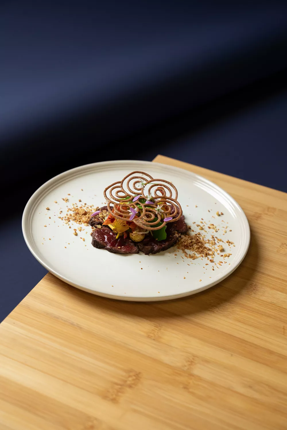 Sappige onglet met een knapperig krokantje van gekaramelliseerde shiitake en sjalot, omlijst door een diepe kombu jus en frisse gepekelde radijsjes voor een perfecte balans tussen umami en zuur. Fijne julienne groentjes, een heldere kruidenolie en een hartige walnootkombu crumble geven textuur en karakter; technieken als aanbakken, inkoken, karamelliseren en vacuümpekeling maken dit gerecht ideaal voor een feestelijk lente- of herfstmenu.