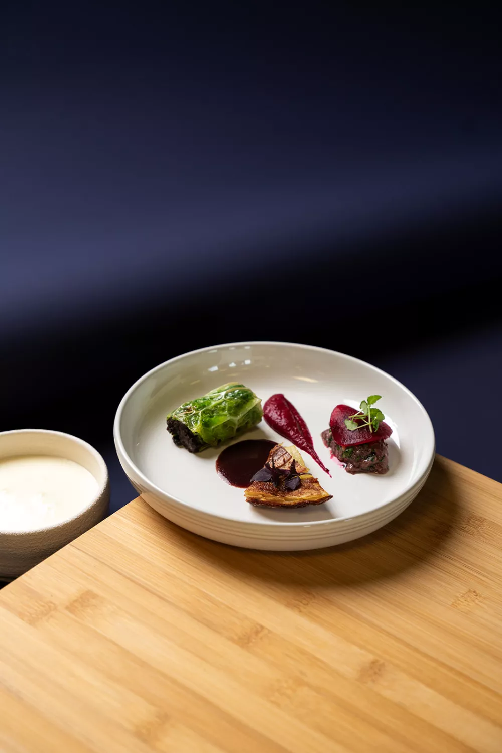 Leg een gevulde koolrol harmonieus op een bord, maak een langwerpig balletje met de tartaar van onglet en bedek met een dun schijfje bietenpickles.