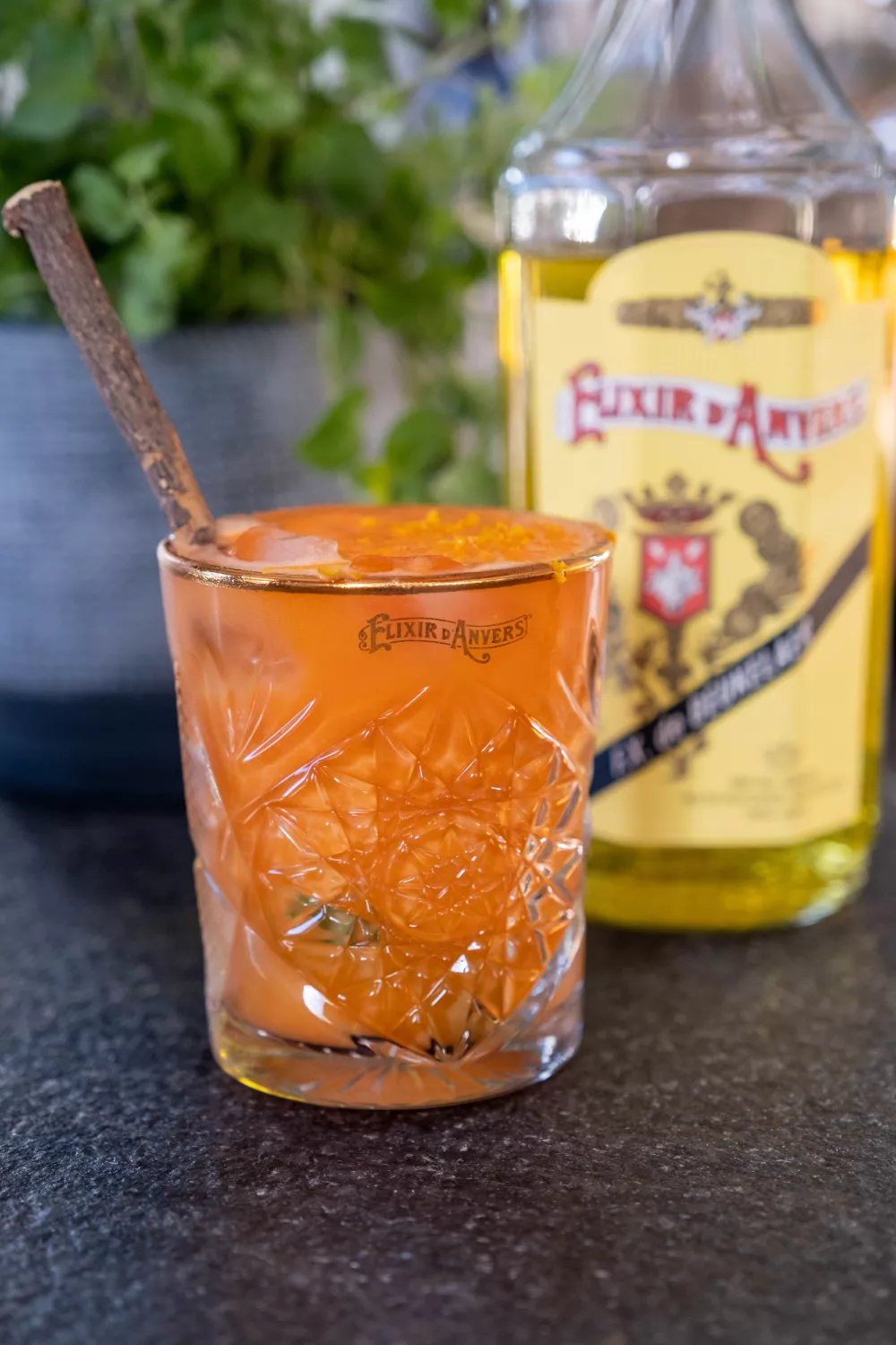 Ontbijtcocktail met Elixir d'Anvers, wortel en sinaasappel