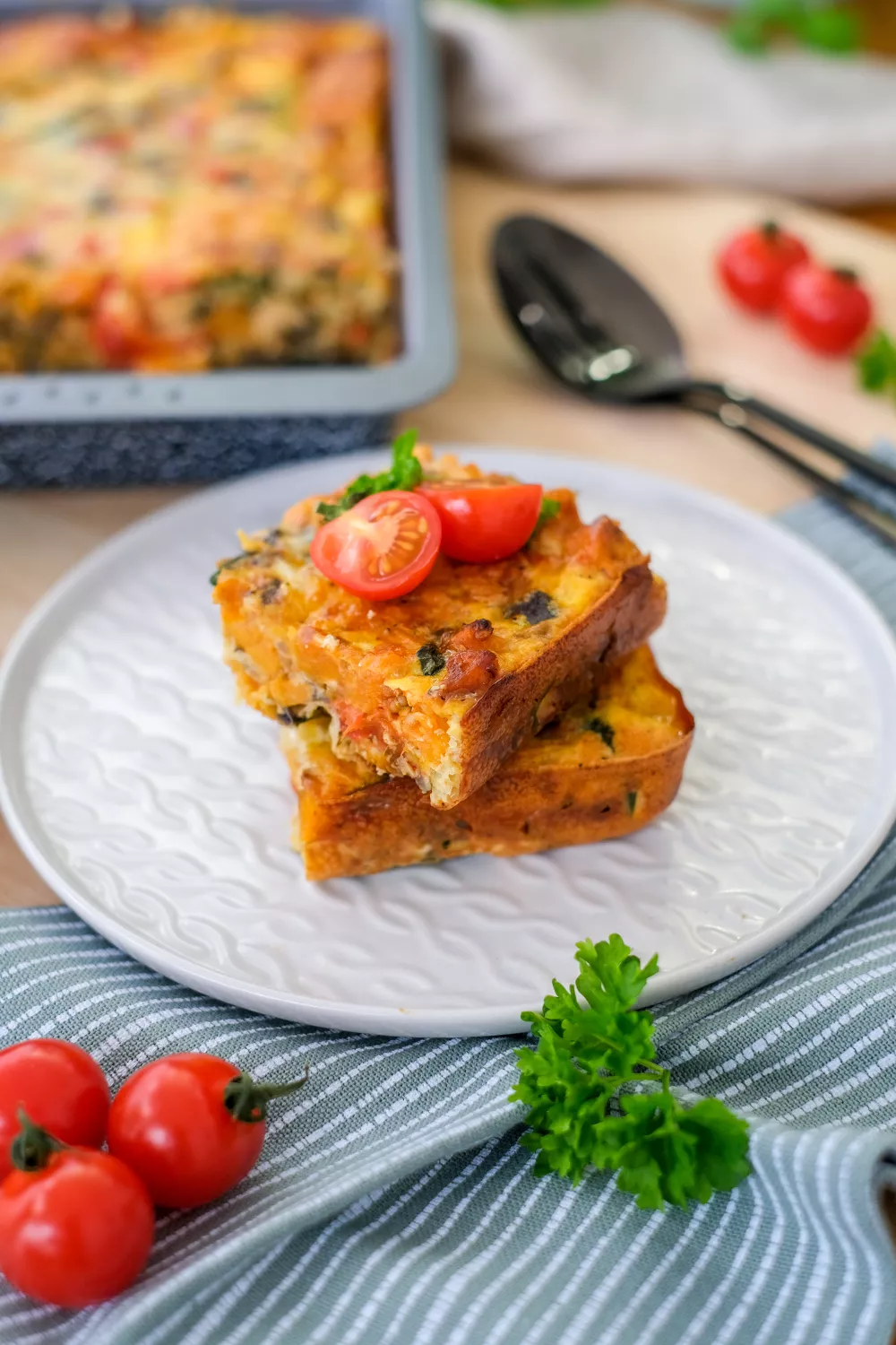 Deze hartige ontbijtschotel brengt zachte blokjes zoete aardappel samen met rode paprika, champignons, spinazie en romige mozzarella voor een kleurrijk en voedzaam ontbijt of weekendbrunch. De groenten worden kort gestoofd met een vleugje look en daarna overgoten met een luchtig eimengsel voordat alles in de oven goudbruin bakt. Ideaal voor herfstige ochtenden of wanneer je zin hebt in een gezond troostrijk gerecht.