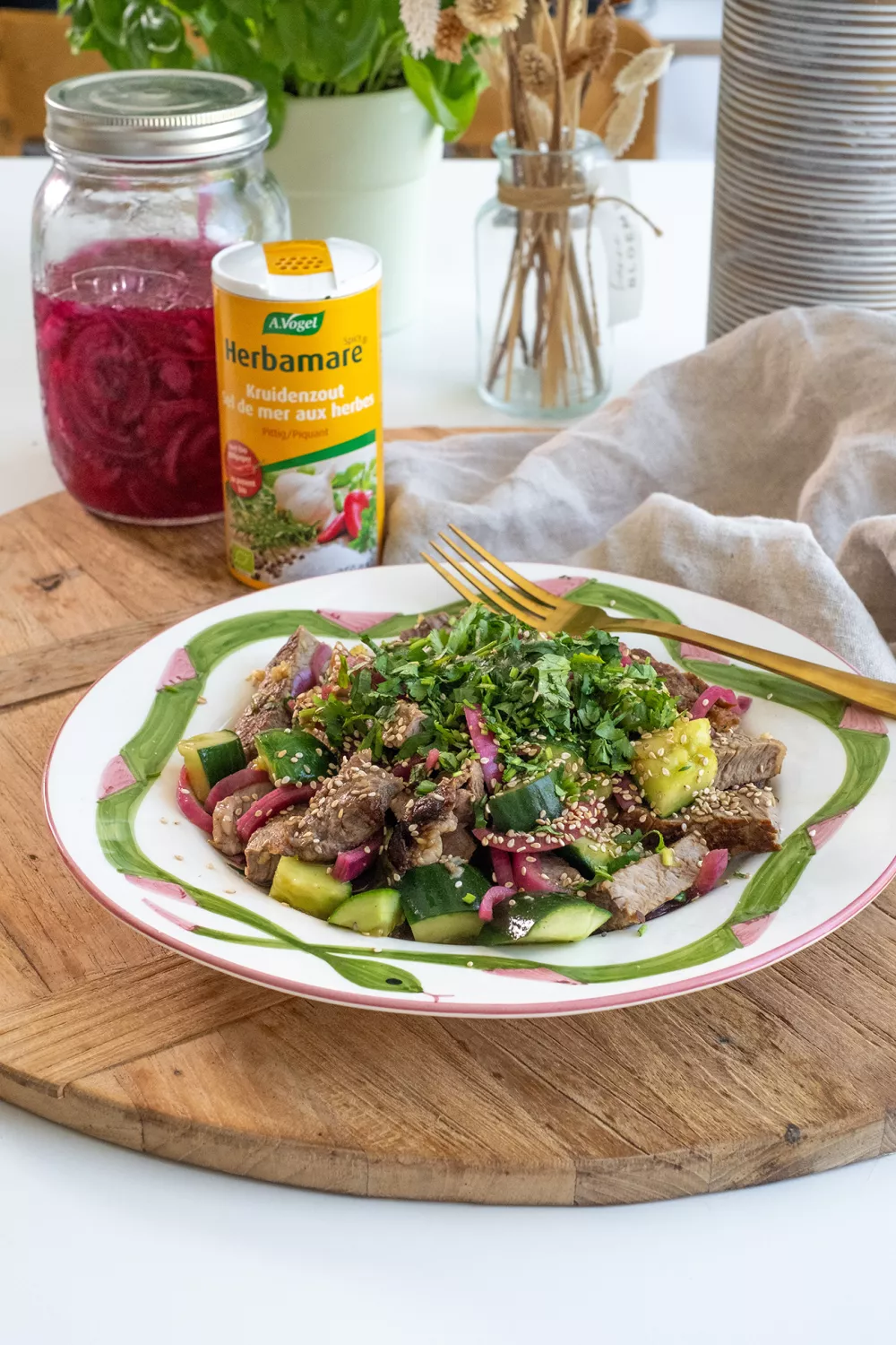 Dit frisse oosters slaatje combineert sappige steakreepjes met smashed komkommer, zoetzure ui en een pittige dressing op basis van sojasaus en sesamolie. Afgewerkt met koriander en Herbamare Spicy voor extra smaak.