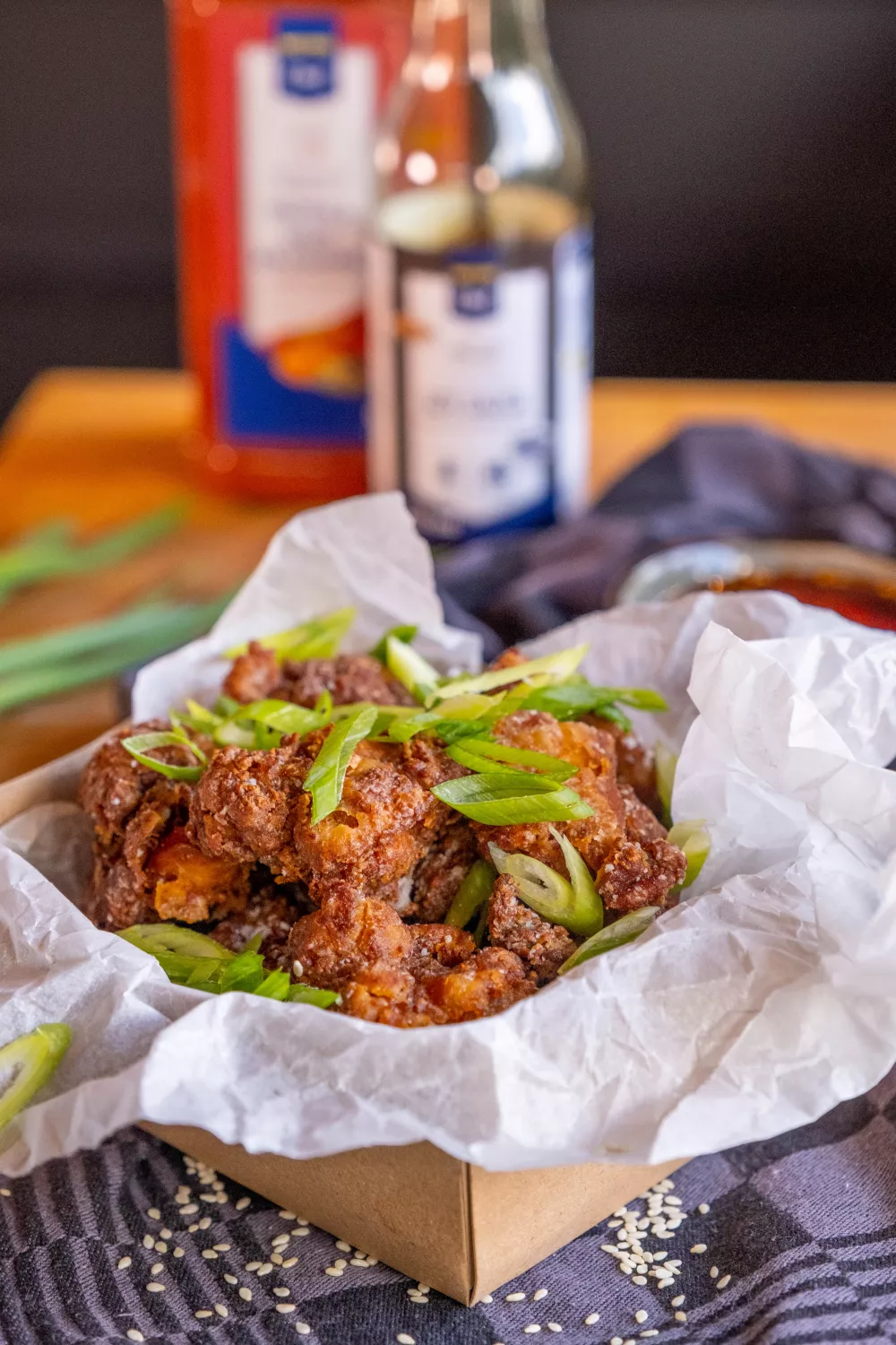 Deze oosterse crispy chicken combineert knapperig gefrituurde stukjes kip met een geurige marinade van sojasaus, gember en knoflook en een pittige chiliolie. Perfect als borrelhap of hoofdgerecht bij een Aziatisch geïnspireerde maaltijd voor lente en zomer. Met maïszetmeel voor extra crunch en lenteui als frisse toets zet je snel een smaakvol gerecht op tafel.