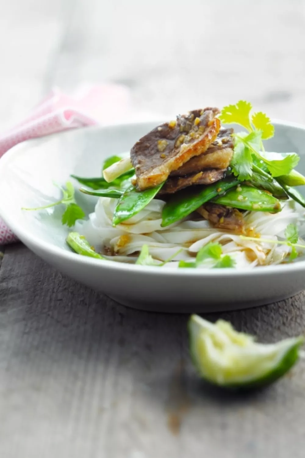 Voeg de reepjes eendenborst weer toe en serveer met koriander, limoen en rijstnoedels.