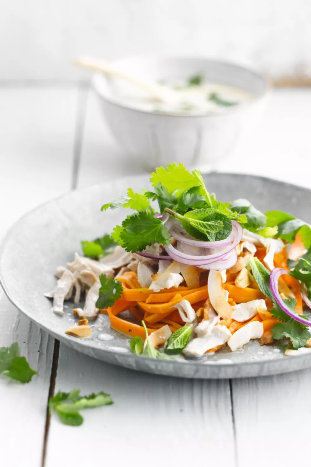 Een frisse oosterse kalkoensalade met romige kokos, zachte kalkoen en knapperige groenten, ideaal als lichte lunch of zomerse maaltijd. De kalkoen pocheer je in een aromatische marinade van kokosmelk, limoen, kafirblaadjes en citroengras; daarna worden zoete aardappel en wortel snel gewokt en afgemaakt met geroosterde kokosschilfers en pinda's. Serveer met verse koriander en munt voor een frisse kruidige toets en een mix van texturen die zowel doordeweeks als tijdens een zomerse picknick bevalt.