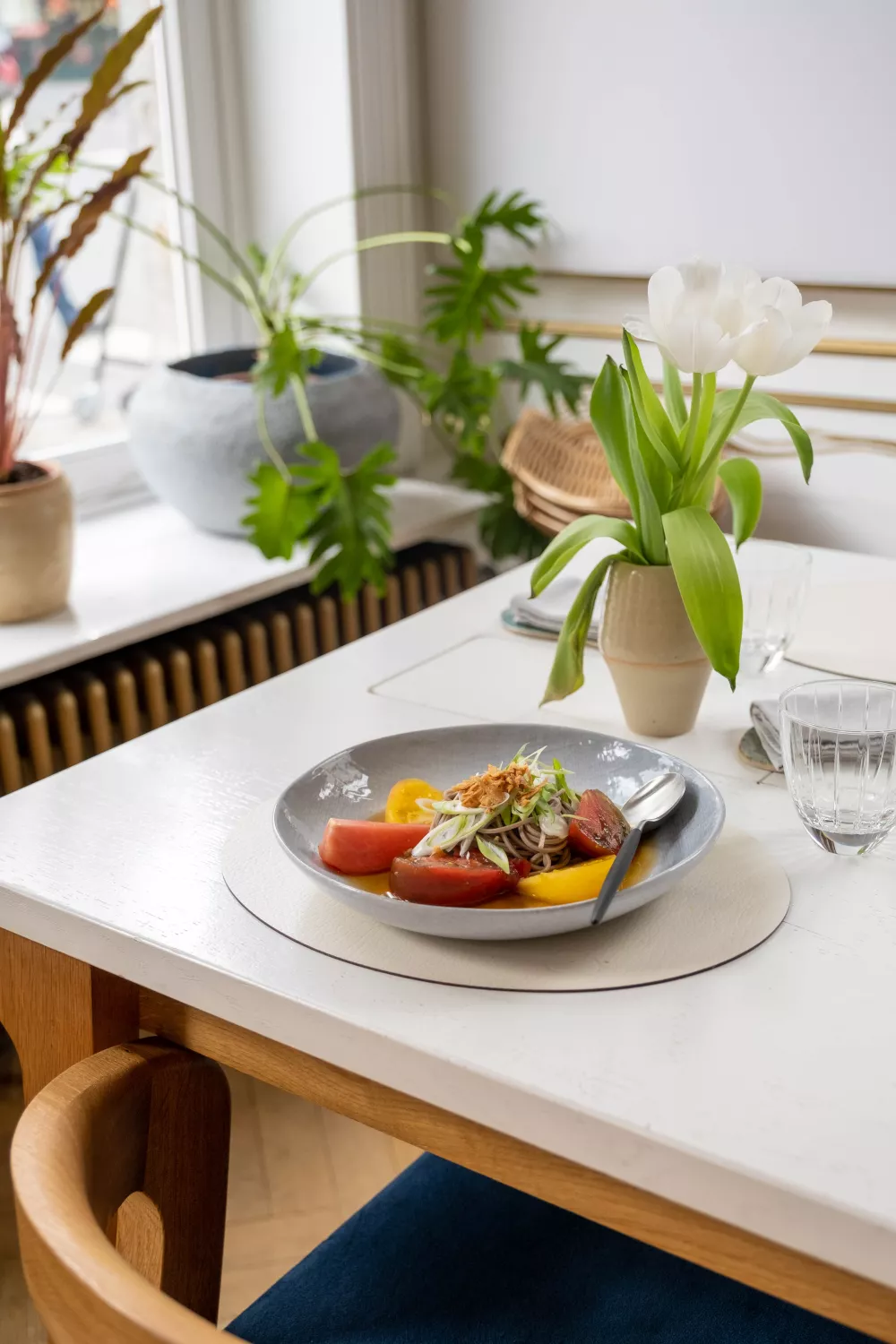 Frisse oosterse noedelsalade met sappige Toma'Chef tomaten en een romige puree van geroosterde aubergine, op smaak gebracht met gekonfijte citroen en umami rijke tamari. Soba noedels en een licht gekruide groentebouillon geven het gerecht tegelijk luchtigheid en verwarmend comfort, ideaal als zomerse lunch of vegetarisch diner. Tomaten worden kort geblancheerd, aubergine geroosterd en gepureerd voor volle smaak en mooie textuur.