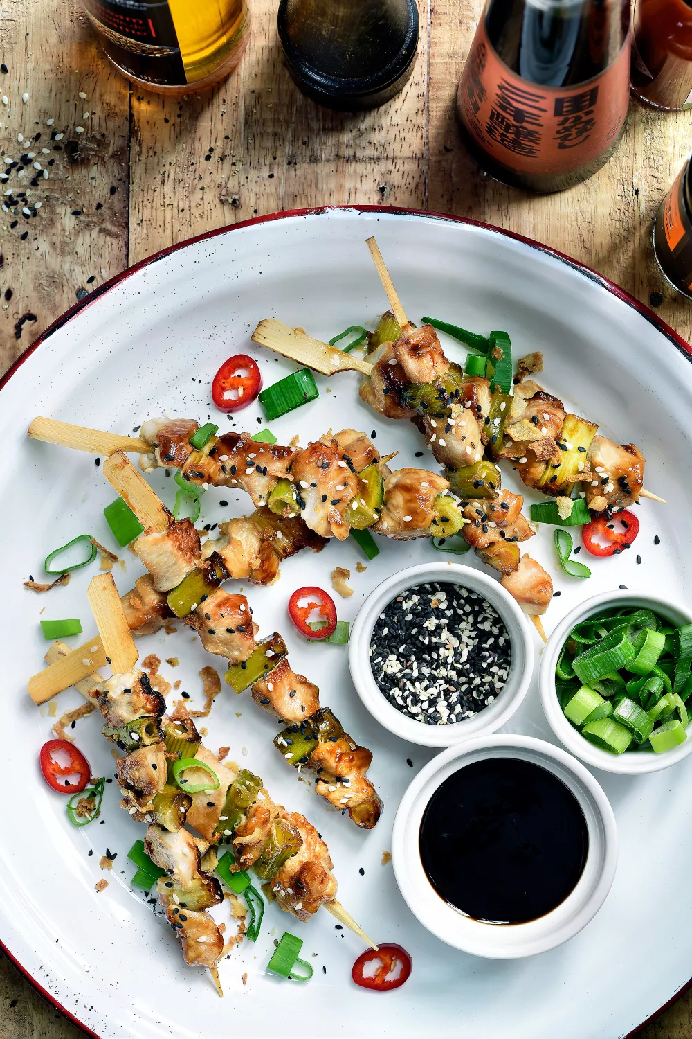 Grill de spiesjes tot de kip helemaal gaar is en leg ze vervolgens op een bord. Werk ze nog af met sesamzaadjes, fijngehakte chilipeper en extra lente-ui. Serveer met de overige saus om in te dippen.