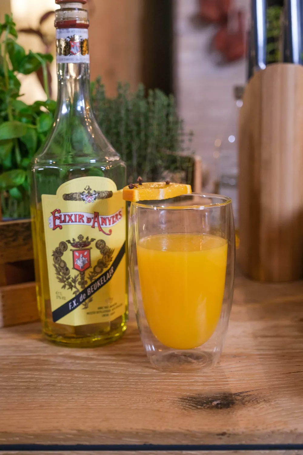 Doe het sinaasappelsap samen met de Elixir d’Anvers in een steelpannetje. Voeg er twee kruidnagels aan toe. Warm op tot aan het kookpunt op het vuur of op de barbecue.