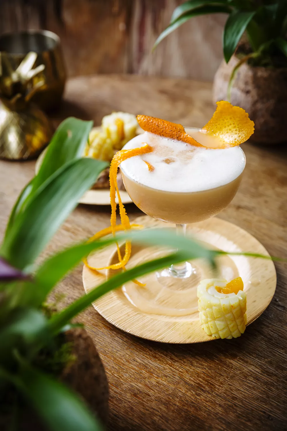 Een levendige combinatie van citrus en zee: pangebakken pijlinktvis met sappige sinaasappelpartjes en een fluweelachtige cocktail van sinaasappel, kokosmelk en madeira. De cocktail wordt krachtig geschud en afgerond met gebrande sinaasappelzeste, terwijl de inktvis in olijfolie en verse kurkuma kort wordt dichtgeschroeid zodat hij mooi opkrult. Perfect voor een zomerse borrel of als lichte visschotel bij tapasavonden.