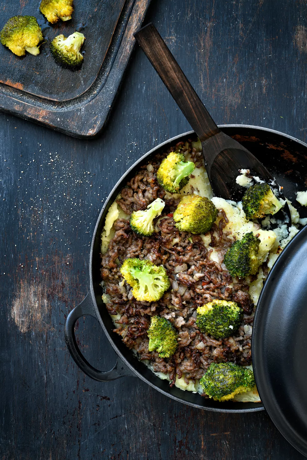 Ovenschotel met rundsgehakt, pastinaak en geroosterde broccoli
