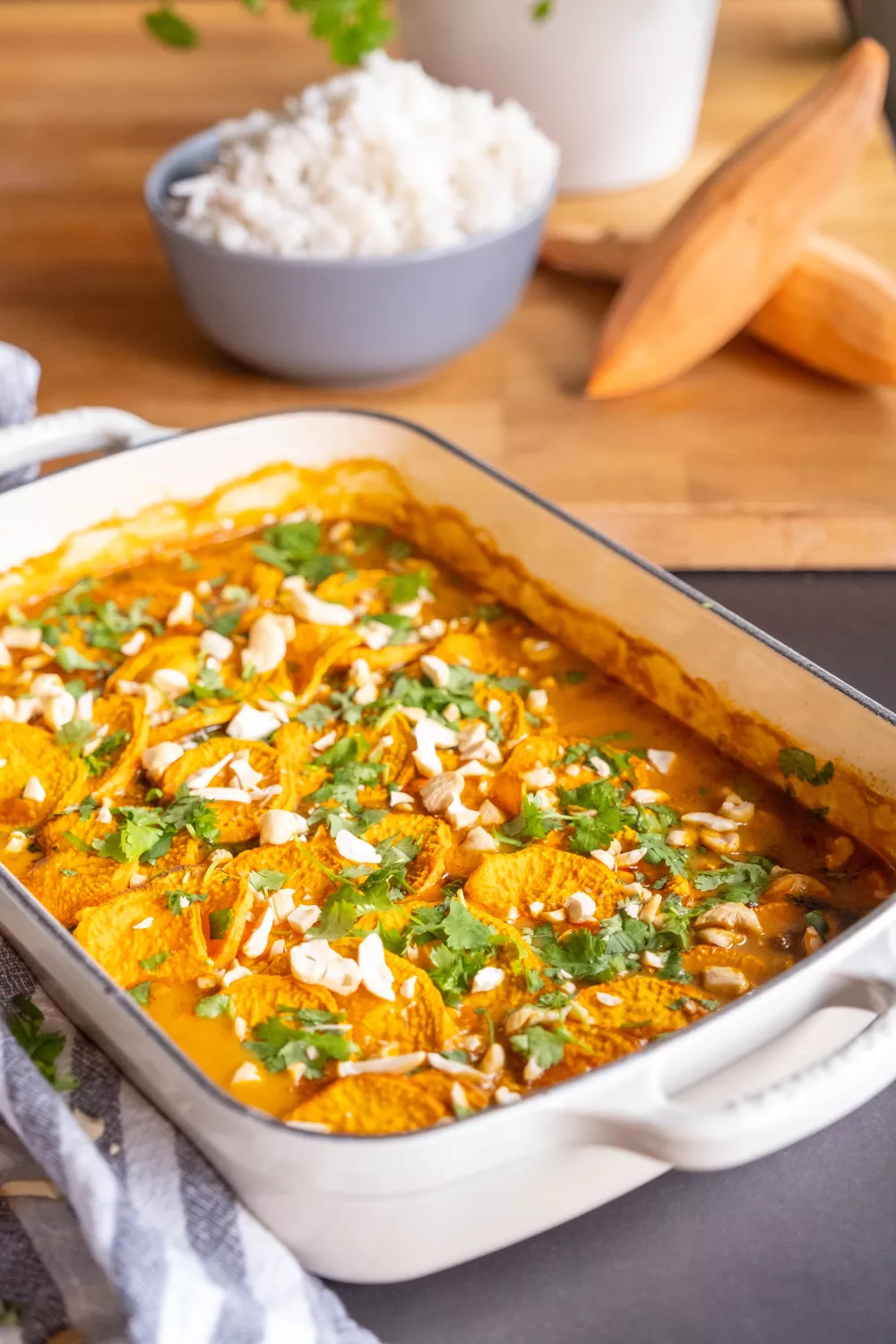 Deze rijke ovenschotel combineert smeuïge kokos curry met zoete aardappel, verse spinazie en knapperige sugarsnaps voor een troostrijke maaltijd met een Aziatische toets. Met rode currypasta en kokosmelk laat je eerst de saus sudderen en daarna gaart alles samen in de oven. Serveer met rijst, koriander en cashewnoten voor een kleurrijk doordeweeks diner dat perfect past bij herfstige avonden.