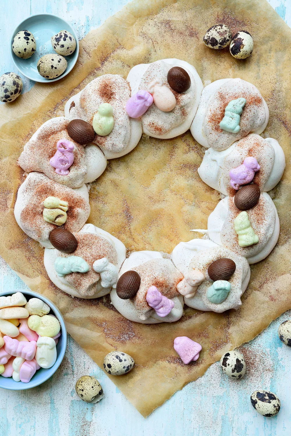 Deze luchtige paaskrans van meringue is een feestelijk lente dessert met een knapperige buitenkant en zachte, smeltende binnenkant. Het eiwitschuim wordt stijfgeklopt met suiker, azijn en maïszetmeel en langzaam in de oven gedroogd tot een elegante krans. Afgewerkt met stijfgeklopte slagroom, een cacaoswirl en kleurrijk paassnoep is dit paasdessert perfect voor brunch, lentefeest of als showstopper op tafel.