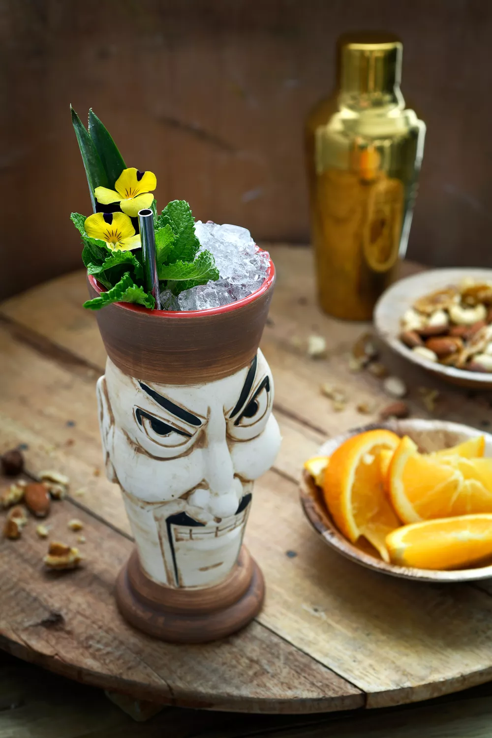 Shake krachtig en giet de ingrediënten in een tiki mug (of groot glas) met gepileerd ijs.