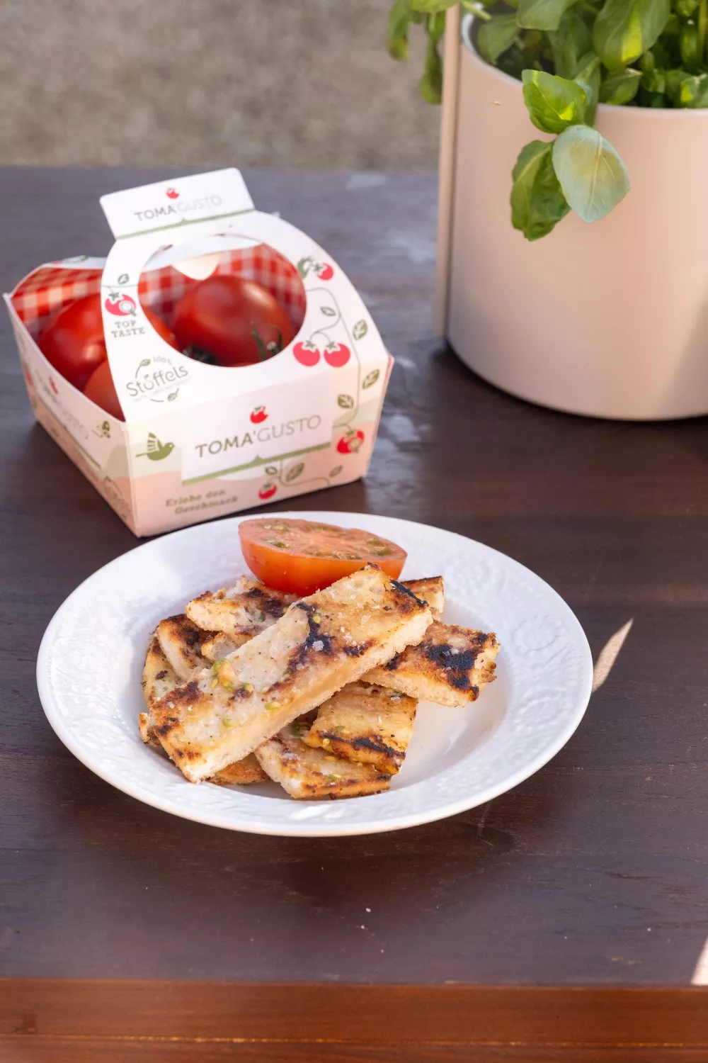 Bestrijk ze met de gekonfijte look. Halveer de tomaten en wrijf ze over de broodjes. Bestrooi nog met grof zout en serveer onmiddellijk.