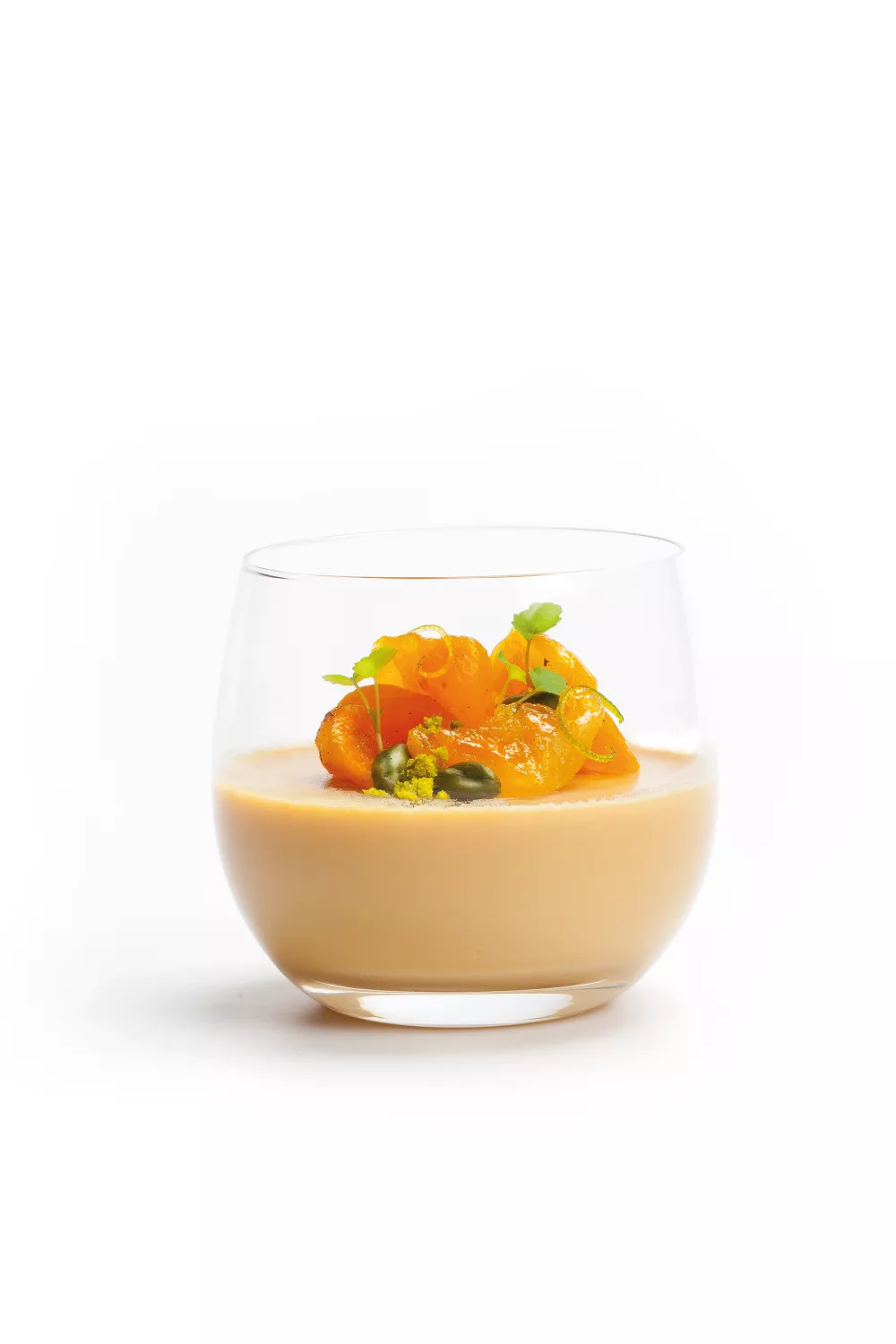 Werk de opgesteven panna cotta af met partjes abrikozen, fijn pistachepoeder, pistachenoten en enkele blaadjes Atsina Cress.