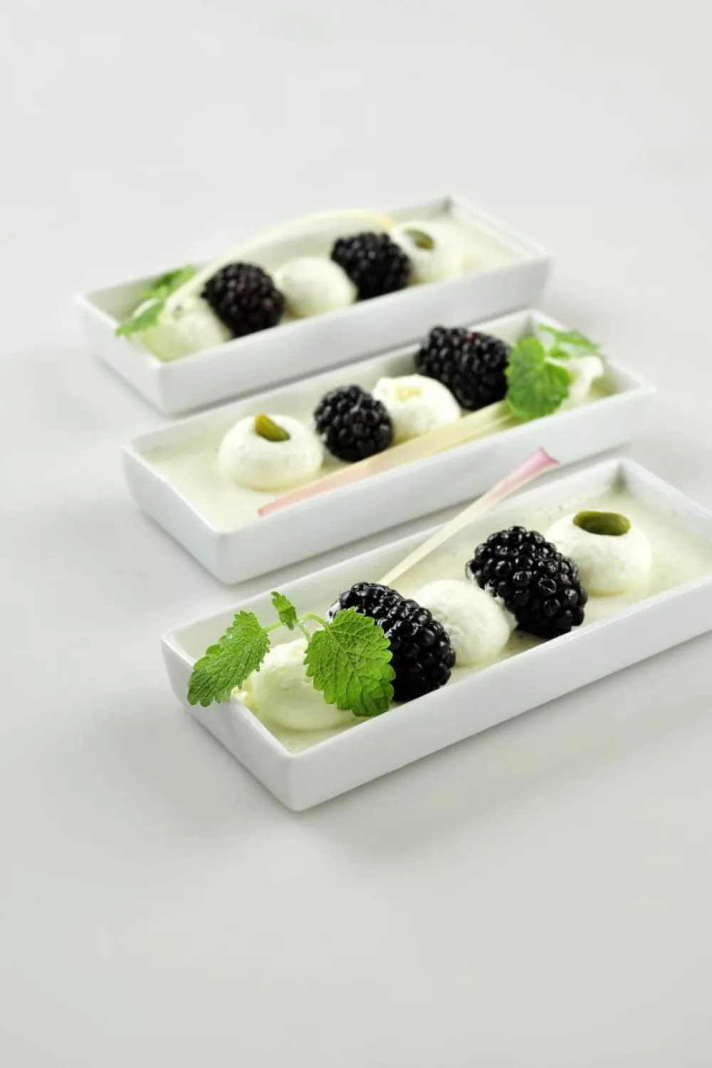Werk af met dotjes slagroom, braambessen, blaadjes munt en eventueel wat gehakte pistachenoten en een stukje citroengras.