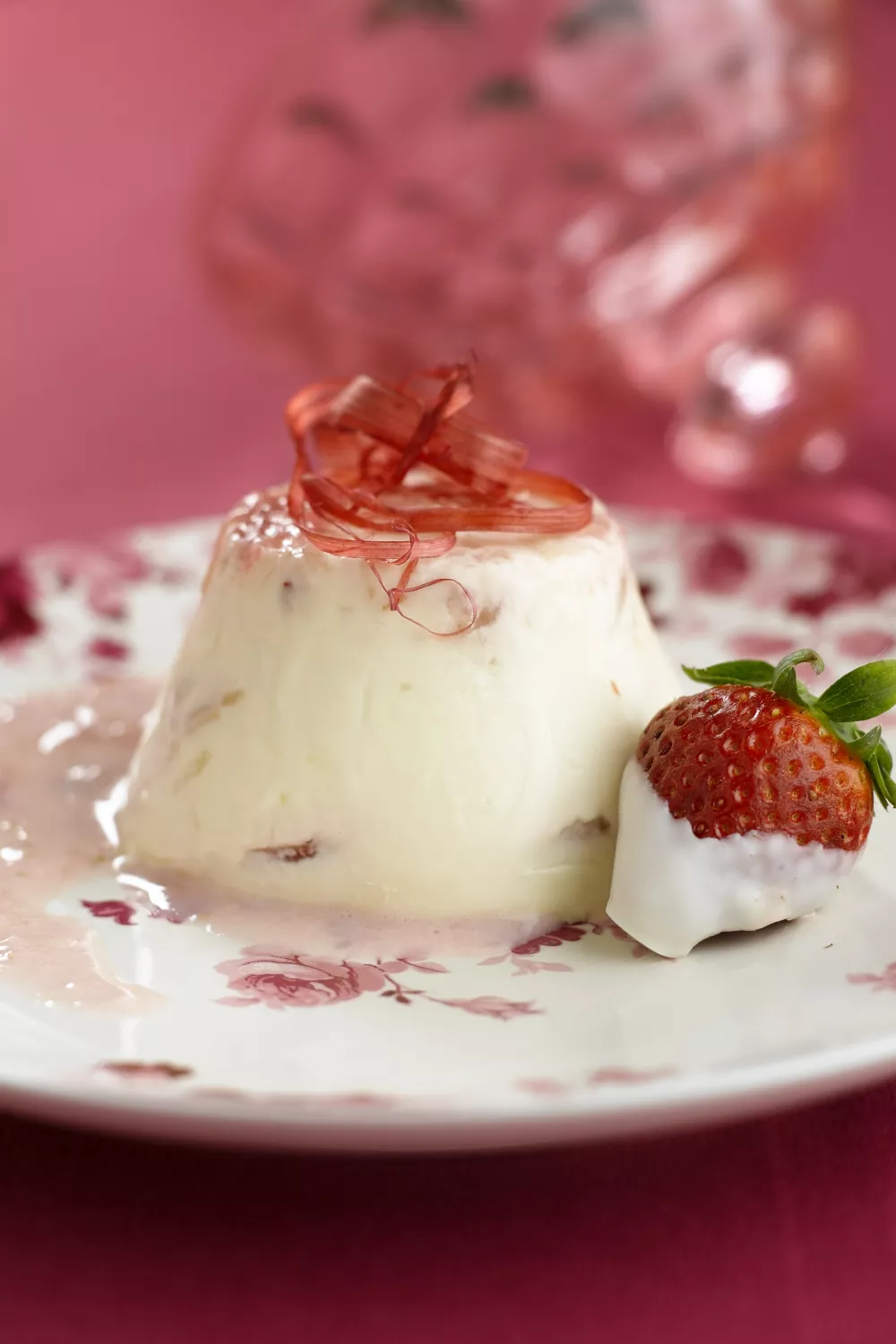 Romige panna cotta met vanille, gestoofde rabarber en geglazuurde aardbeien brengt friszoete lentesmaken naar je desserttafel. De rabarber wordt kort gekookt in een boterkaramel met een hint van rode chili, terwijl de room met gelatine wordt opgezet en in vorm stolt voor een zijdezachte textuur. Werk af met glanzend gepoederde aardbeien en rabarberschilletjes voor een feestelijke presentatie.